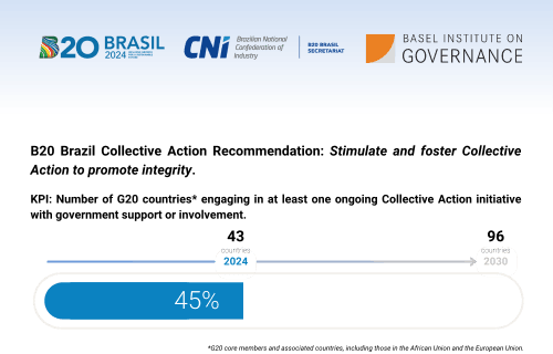 The Basel Institute has actively contributed to the anti-corruption discussions of the B20 since its inception, generally with a formal role as Network and Knowledge Partner. Collective Action has been a reoccurring theme of these discussions and resulting recommendations. A specific milestone was the development of the Collective Action Key Performance Indicator under the 2024 B20 leadership in Brazil. The Basel Institute will continue to track performance against the indicator via the database.